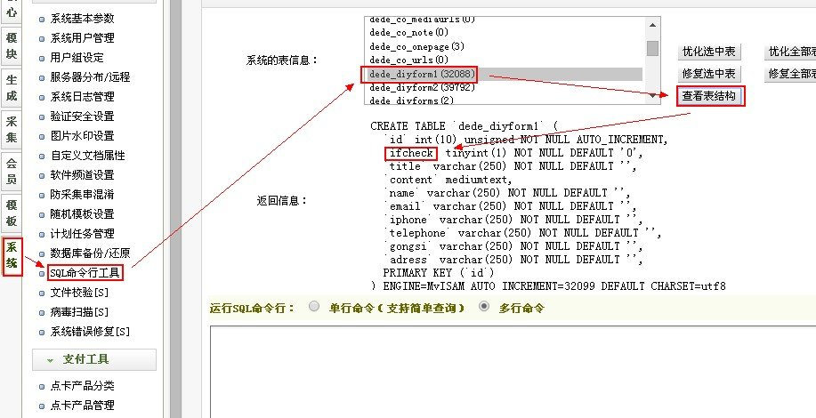 登录网站后台-系统参数-SQL命令行工具,找到dede_diyform1(),然后查看表结构,找到以下`ifcheck` smallint(6) NOT NULL default '1',ifcheck就是我们解决问题的关键。如下图: