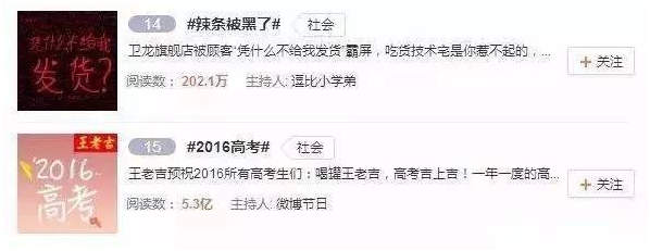 ?在当天卫龙被黑事件官方微博的互动量高达17万,进入微博实时热搜榜第10名跟热门话题第四名。
