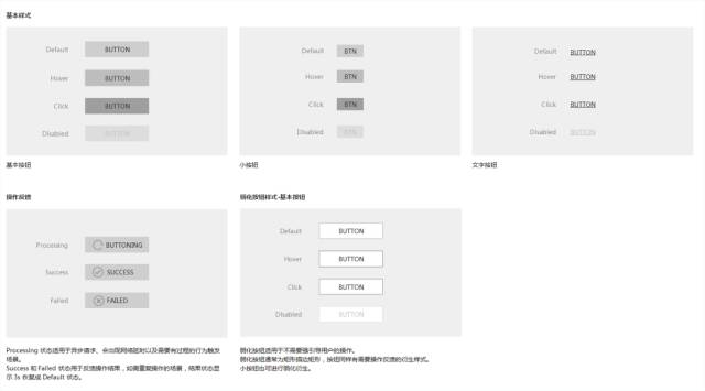 以按钮为例,在描述按钮状态时候按照默认状态、触发(激活态)、操作反馈、异常状态—禁用和报错、其他样式。
