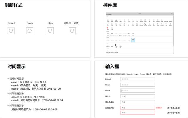 前期产品搭建速度很快,但都是基础功能,所以在交互组件的选择上可以和产品同步。如,刷新、Hover样式、时间显示、输入框、对话框和基础元件库等。如下所示: