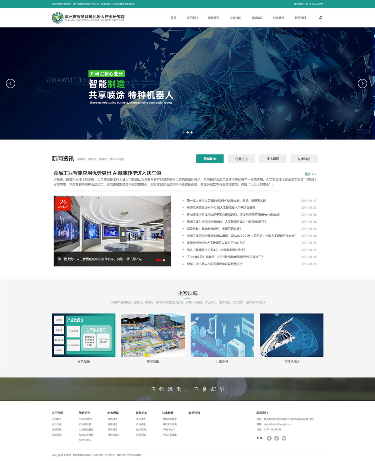 郑州智研院 建设项目:智慧机器人 / 研究院网站 发布时间:2021-02-09 浏览:444 郑州市智慧环境机器人产业研究院依托国家高层次人才在智能制造、工业互联网等新兴前沿领域技术资源,以传统产业高端化、绿色化、智能化、协同化转型升级为目标,开展人才引进、产业孵化、成果转化、技术咨询、生产应用等工作,为中原区域提供战略咨询和前瞻性研究支持。